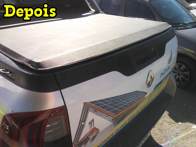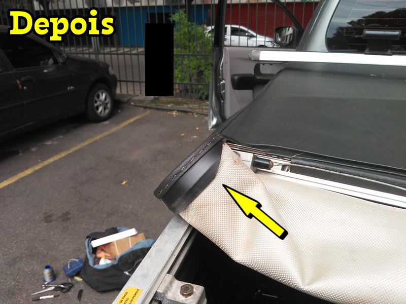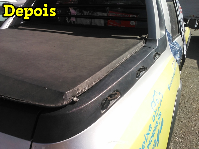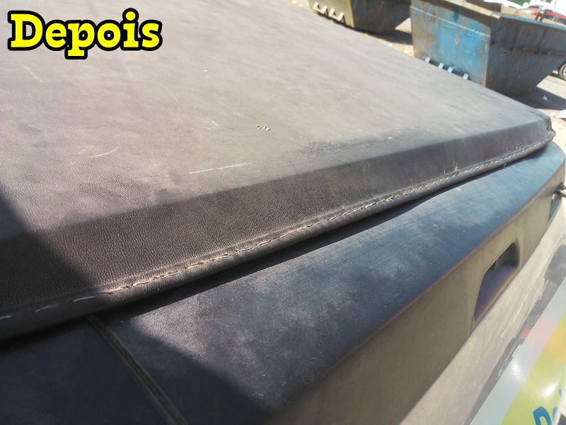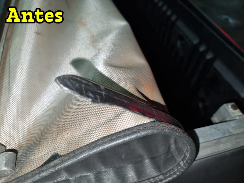 Toda a restauração que fazemos sempre costuramos as duas laterais e a parte traseira mesmo que não esteja soltando a parte de trás da capota e se for necessário fazemos a reposição do debrum e/ou o perfil de encaixe conforme você pode ver nas fotos abaixo de uma capota que restauramos. Só não trocamos a lona e nem peças de encaixe de metal.